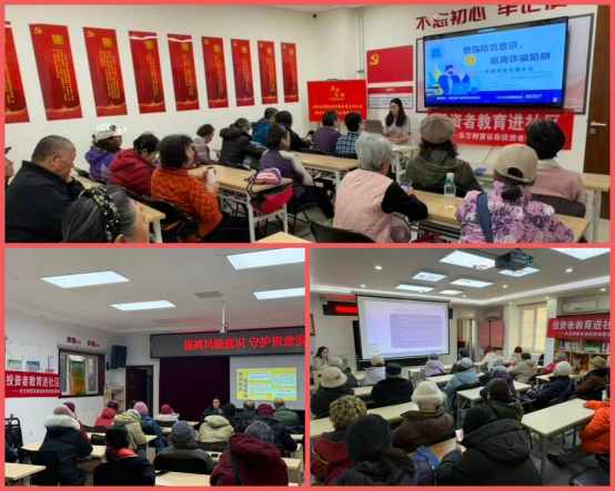 为深入贯彻落实北京市打非工作小组办公室及北京证监局关于加强岁末年初金融安全保障的工作部署,切实提升社会公众、特别是老年群体的风险防范意识,东方财富证券投资者教育基地于1月14日、15日及19日,先后深入北京市朝阳区樱花园社区、武圣东里社区及关东店北街社区,成功举办了以“增强防范意识,远离诈骗陷阱”为主题的系列投资者教育专项活动,共71名居民到场参加。
